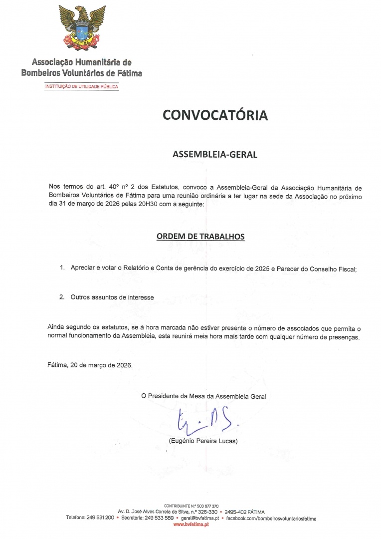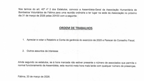 Nos termos e para os efeitos do disposto no n.º 1 do artigo 63.º dos Estatutos da Associação Humanitária de Bombeiros Voluntários de Fátima, anuncia?se a abertura do Processo Eleitoral para eleição dos órgãos sociais da Associação para o triénio 2026/2029, cuja Assembleia Geral Eleitoral decorrerá no dia 21 de maio de 2026, a convocar nos termos previstos nos Estatutos Associação.